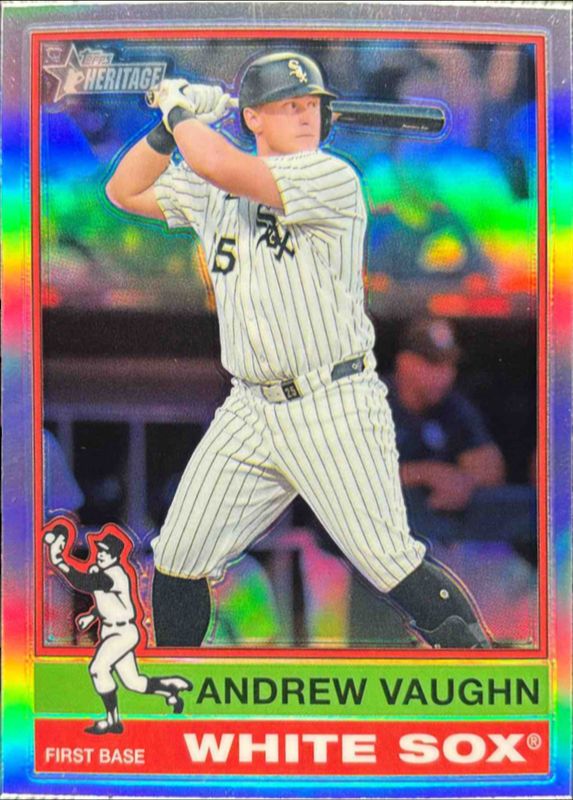 The Andrew Vaughn 2025 Topps Heritage #413 Chrome - Red Refractor card is 1 of 24 Andrew Vaughn's card variations in the 2025 Topps Heritage set being tracked by Sports Card Investor, including Base, Black Border, Dark Blue Border, Dark Green Border, and Dark Yellow Border.