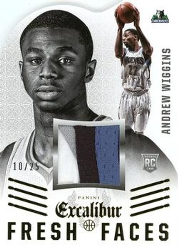 The Andrew Wiggins 2014 Excalibur #28 Fresh Faces - Prime /25 Rookie card is 1 of 28 Andrew Wiggins' card variations in the 2014 Excalibur set being tracked by Sports Card Investor, including Base, Blue, Knights Templar, Orange, and Silver /49.