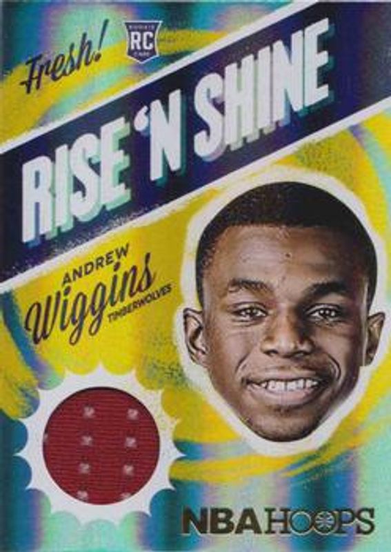 The Andrew Wiggins 2014 Hoops #1 Rise N' Shine Memorabilia Rookie card is 1 of 20 Andrew Wiggins' card variations in the 2014 Hoops set being tracked by Sports Card Investor, including Base, Gold, Green, Red Back, and Silver /399.