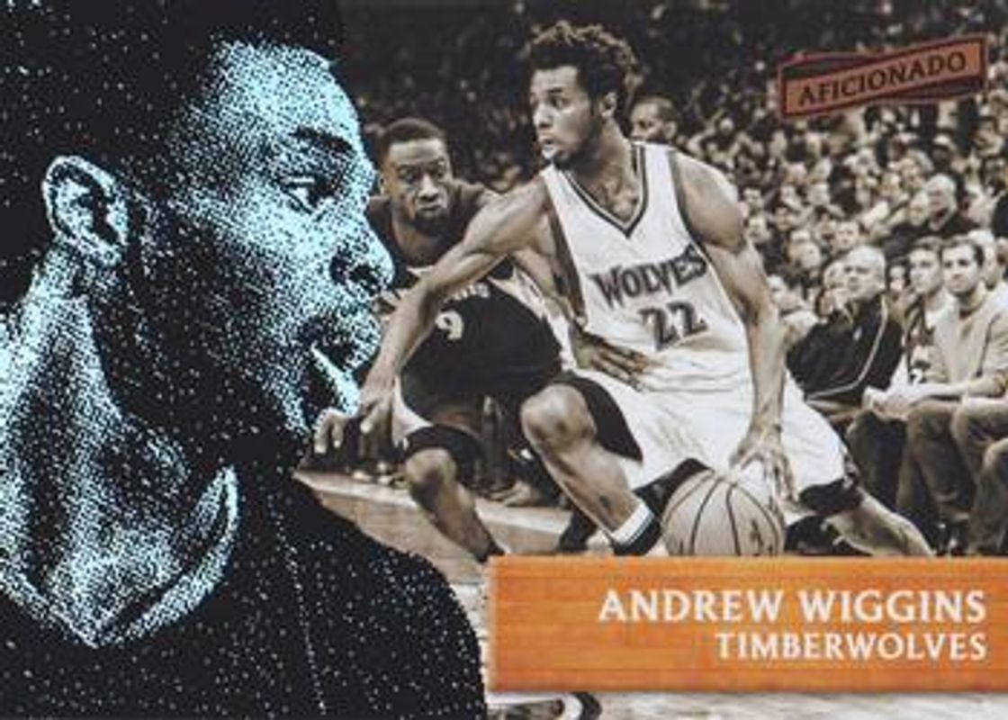 The Andrew Wiggins 2016 Aficionado #29 Base card is 1 of 18 Andrew Wiggins' card variations in the 2016 Aficionado set being tracked by Sports Card Investor, including #110 Base, #110 Artist's Proof, #29 Artist's Proof, #29 Opening Night Preview Edition, and #29 Tip Off.