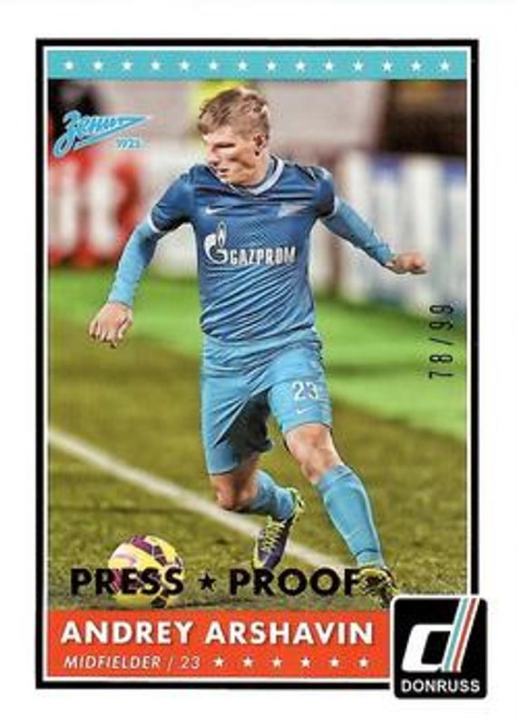 The Andrey Arshavin 2015 Donruss #83 Gold Press Proof /99 card is 1 of 8 Andrey Arshavin's card variations in the 2015 Donruss set being tracked by Sports Card Investor, including Base, Bronze Press Proof /299, Silver Press Proof /199, Red Soccer Ball /49, and Green Soccer Ball /25.