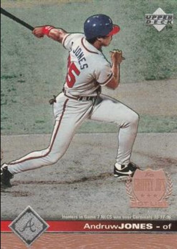 The Andruw Jones 1997 Upper Deck #415 Base card is 1 of 11 Andruw Jones' card variations in the 1997 Upper Deck set being tracked by Sports Card Investor, including #196 Base, #240 Base, #262 Base, #324 Base, and #HC2 Hot Commodities.