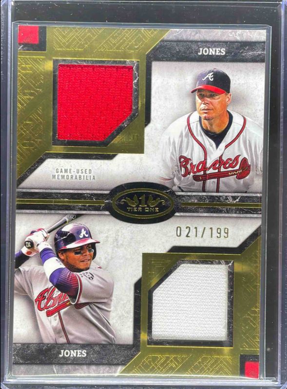 The Andruw Jones / Chipper Jones 2025 Topps Tier One #DPR-JJ Dual Player Relics /199 card is 1 of 4 Andruw Jones / Chipper Jones' card variations in the 2025 Topps Tier One set being tracked by Sports Card Investor, including Dual Player Relics - Green /40, Dual Player Relics - Patch /10, and Dual Player Relics - Patch Holo Platinum Blue Foil /1.