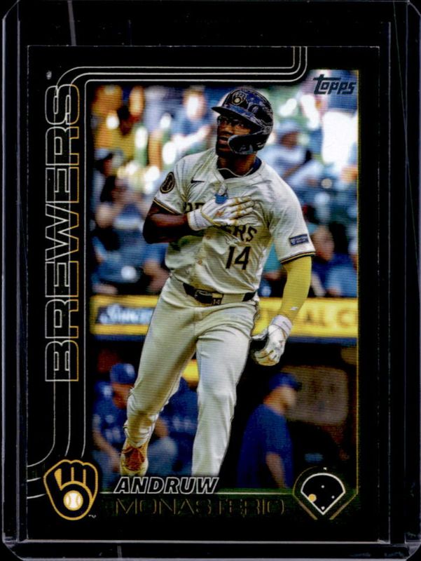The Andruw Monasterio 2025 Topps #581 Black /74 card is 1 of 56 Andruw Monasterio's card variations in the 2025 Topps set being tracked by Sports Card Investor, including Base, Aqua Holo Foil, Diamante Foil, Holo Foil, and Pink Diamante Foil.