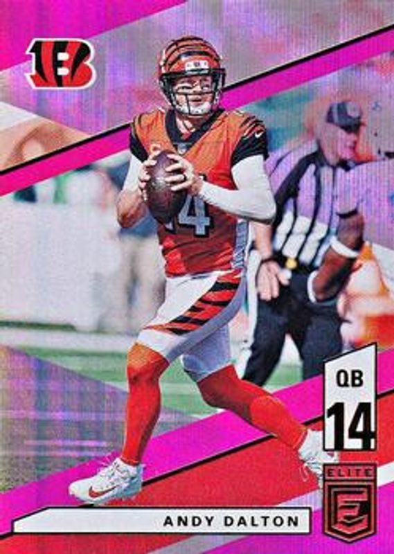 The Andy Dalton 2019 Elite #58 Pink card is 1 of 10 Andy Dalton's card variations in the 2019 Elite set being tracked by Sports Card Investor, including Green, Red /299, Purple /99, Orange /49, and Aspirations Die-Cut /24.