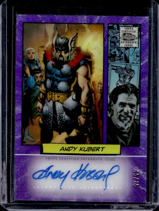The Andy Kubert 2024 Topps Chrome #CA-ANK Authentic Marvel Comic Book Artist Autographs - Purple Refractor /75 card is 1 of 8 Andy Kubert's card variations in the 2024 Topps Chrome set being tracked by Sports Card Investor, including Authentic Marvel Comic Book Artist Autographs Green Gamma RayWave RefractorABC - Wave Refractor /99, Authentic Marvel Comic Book Artist Autographs - Gold Wave Refractor /50, Authentic Marvel Comic Book Artist Autographs - Human Torch Refractor /39, Authentic Marvel Comic Book Artist Autographs - Orange Refractor /25, and Authentic Marvel Comic Book Artist Autographs - Black Wave Refractor /10.