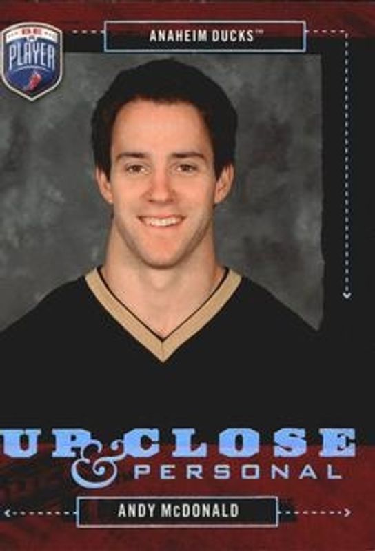 The Andy McDonald 2006 Upper Deck Be a Player #UC6 Up Close & Personal /999 card is 1 of 6 Andy McDonald's card variations in the 2006 Upper Deck Be a Player set being tracked by Sports Card Investor, including Base /999, Autographs /10, BAP Signatures, BAP Signatures SN25 /25, and Up Close & Personal Autographs /10.