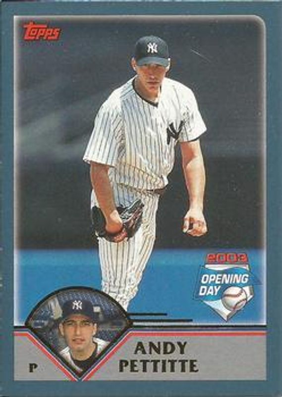 The Andy Pettitte 2003 Topps Opening Day #98 Base card is 1 of 2 Andy Pettitte's card variations in the 2003 Topps Opening Day set being tracked by Sports Card Investor, including Mini Stickers.
