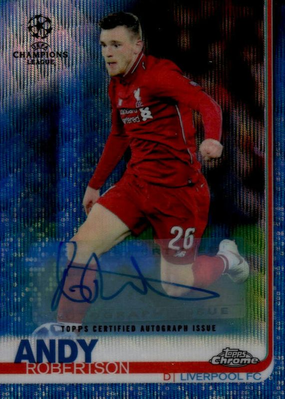 The Andy Robertson 2018 Topps Chrome UEFA Champions League #62 Autographs - Blue Wave Refractor /75 card in Raw condition has not changed in price in the last 30 days and was last sold for $75.00 .