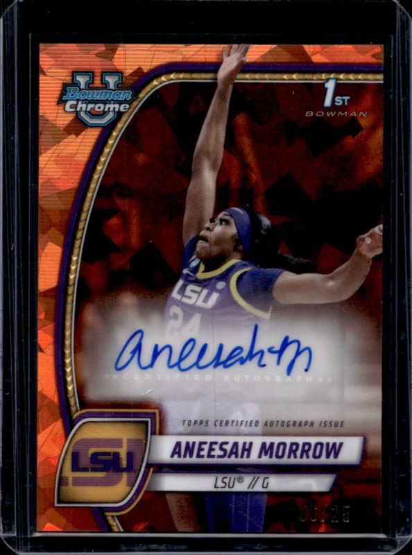 The Aneesah Morrow 2024 Bowman Chrome University Sapphire Edition #6 Prospect Autographs - Orange Refractor /25 card is 1 of 27 Aneesah Morrow's card variations in the 2024 Bowman Chrome University Sapphire Edition set being tracked by Sports Card Investor, including Base, Purple Refractor /100, Yellow Refractor /75, Green Refractor /65, and Gold Refractor /50.