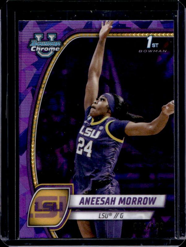 The Aneesah Morrow 2024 Bowman Chrome University Sapphire Edition #6 Purple Refractor /100 card is 1 of 27 Aneesah Morrow's card variations in the 2024 Bowman Chrome University Sapphire Edition set being tracked by Sports Card Investor, including Base, Yellow Refractor /75, Green Refractor /65, Gold Refractor /50, and Orange Refractor /25.