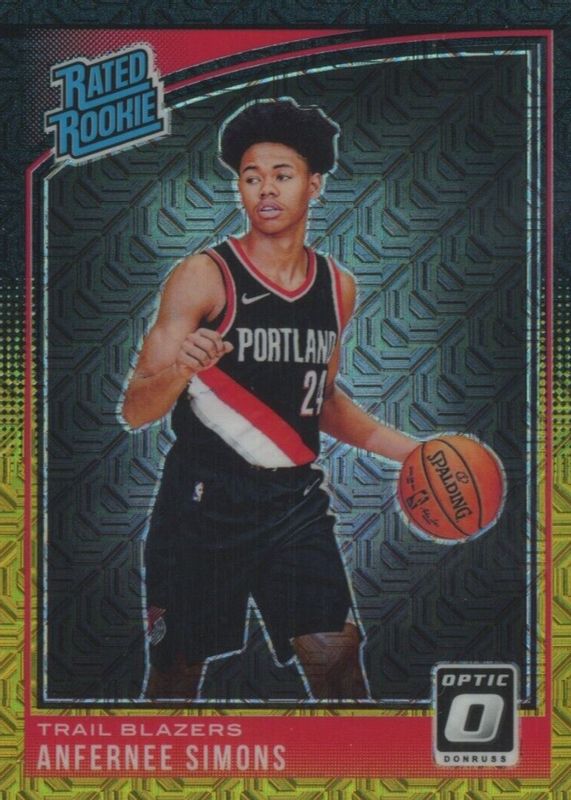 This card is 1 of 33 Anfernee Simons' card variations in the 2018 Optic set being tracked by Sports Card Investor, including Base, Blue Velocity, Checkerboard, Choice, and Fast Break.