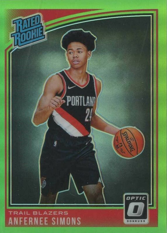 The Anfernee Simons 2018 Optic #186 Lime Green /149 Rookie card in Raw condition has not changed in price in the last 30 days and was last sold for $18.00 .