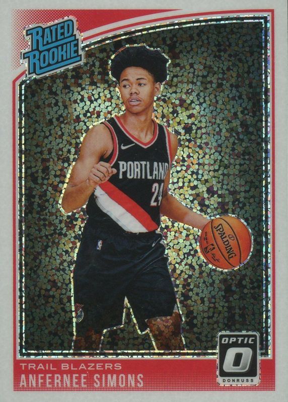 The Anfernee Simons 2018 Optic #186 White Sparkle /(SSP) Rookie card in Raw condition has moved down -$12.23 (-29.8%) in the last 30 days and was last sold for $28.77 .