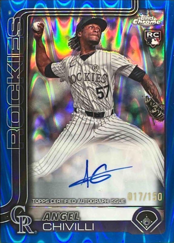 The Angel Chivilli 2025 Topps Chrome #RA-ACH Rookie Autographs - Blue RayWave Refractor /150 card is 1 of 21 Angel Chivilli's card variations in the 2025 Topps Chrome set being tracked by Sports Card Investor, including Rookie Autographs, Rookie Autographs - B&W Mini-Diamond Refractor, Rookie Autographs - Refractor /499, Rookie Autographs - Purple Speckle Refractor /299, and Rookie Autographs - Purple Refractor /250.