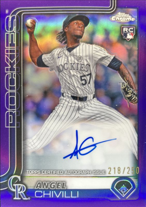The Angel Chivilli 2025 Topps Chrome #RA-ACH Rookie Autographs - Purple Refractor /250 card is 1 of 21 Angel Chivilli's card variations in the 2025 Topps Chrome set being tracked by Sports Card Investor, including Rookie Autographs, Rookie Autographs - B&W Mini-Diamond Refractor, Rookie Autographs - Refractor /499, Rookie Autographs - Purple Speckle Refractor /299, and Rookie Autographs - Aqua Wave Refractor /199.