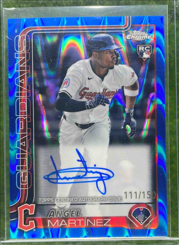 The Angel Martinez 2025 Topps Chrome #RA-AMA Rookie Autographs - Blue RayWave Refractor /150 card is 1 of 81 Angel Martinez's card variations in the 2025 Topps Chrome set being tracked by Sports Card Investor, including Base, Geometric Refractor, Lightboard Logo Variation, Negative Refractor, and Prism Refractor.