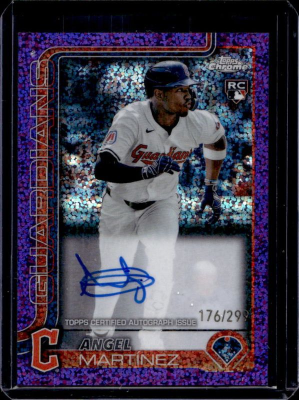 The Angel Martinez 2025 Topps Chrome #RA-AMA Rookie Autographs - Purple Speckle Refractor /299 card is 1 of 81 Angel Martinez's card variations in the 2025 Topps Chrome set being tracked by Sports Card Investor, including Base, Geometric Refractor, Lightboard Logo Variation, Negative Refractor, and Prism Refractor.