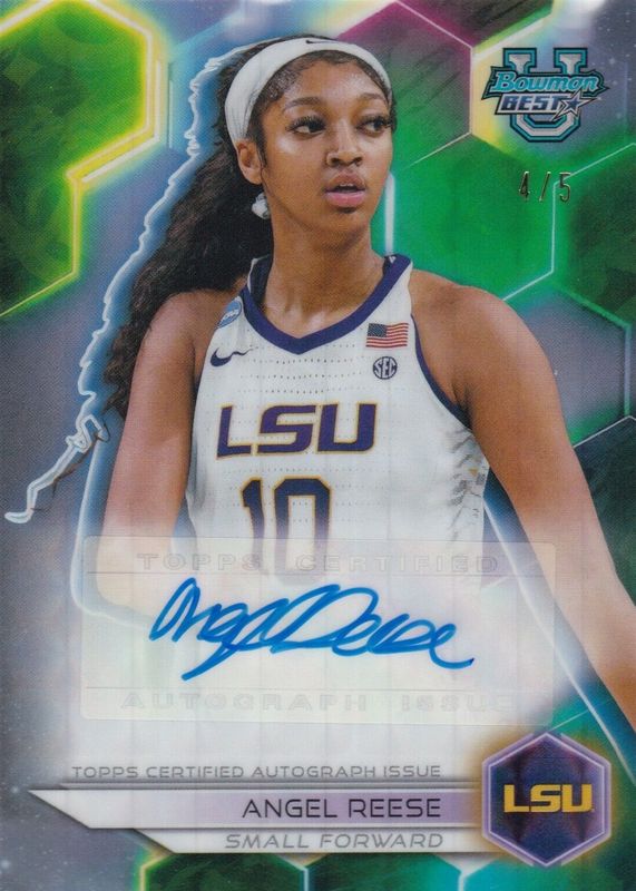 This card is 1 of 70 Angel Reese's card variations in the 2023 Bowman Best University set being tracked by Sports Card Investor, including Base, Refractor, Speckle Refractor, Blue Refractor /150, and Pink Lava Refractor /100.