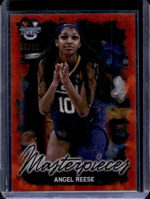 The Angel Reese 2023 Bowman Best University #BM-20 Masterpieces - Orange Refractor /25 card is 1 of 70 Angel Reese's card variations in the 2023 Bowman Best University set being tracked by Sports Card Investor, including Base, Refractor, Speckle Refractor, Blue Refractor /150, and Pink Lava Refractor /100.