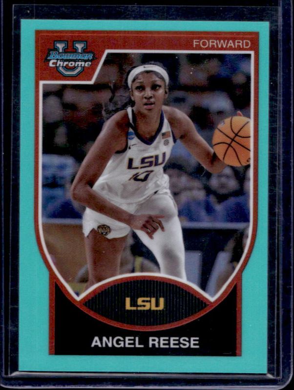 The Angel Reese 2023 Bowman Chrome University #07B-11 2007-08 Bowman - Aqua Refractor /150 card is 1 of 63 Angel Reese's card variations in the 2023 Bowman Chrome University set being tracked by Sports Card Investor, including Base (1st), Base, Pink Refractor (1st), Purple Shimmer Refractor (1st), and Refractor (1st).