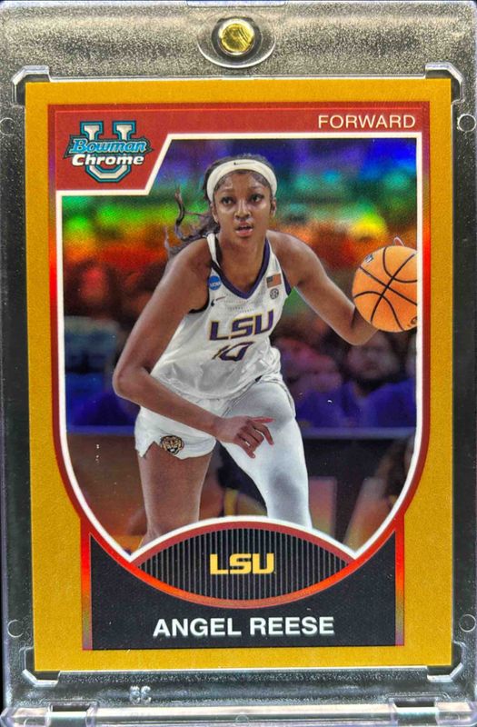 The Angel Reese 2023 Bowman Chrome University #07B-11 2007-08 Bowman - Gold Refractor /50 card is 1 of 63 Angel Reese's card variations in the 2023 Bowman Chrome University set being tracked by Sports Card Investor, including Base (1st), Base, Pink Refractor (1st), Purple Shimmer Refractor (1st), and Refractor (1st).