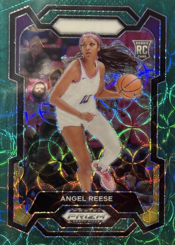 The Angel Reese 2024 Prizm Draft Picks #38 Green Scope /8 Rookie card in Raw condition has not changed in price in the last 30 days and was last sold for $48.50 .