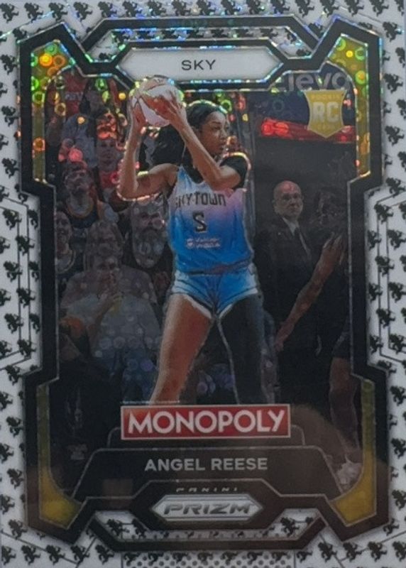 The Angel Reese 2024 Prizm Monopoly WNBA #68 Monopoly Man Black & White Rookie card in Raw condition has not changed in price in the last 30 days and was last sold for $29.99 .