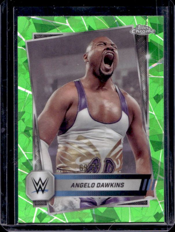 The Angelo Dawkins 2025 Topps Chrome WWE Sapphire Edition #63 Base Chrome - Green Refractor /75 card is 1 of 11 Angelo Dawkins' card variations in the 2025 Topps Chrome WWE Sapphire Edition set being tracked by Sports Card Investor, including Base Chrome, Blue Brand Autographs, Base Chrome - Gold Refractor /50, Base Chrome - Orange Refractor /25, and Blue Brand Autographs - Orange Refractor /25.