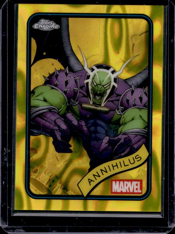 The Annihilus 2025 Topps Chrome #118 Yellow Lava Refractor card is 1 of 23 Annihilus' card variations in the 2025 Topps Chrome set being tracked by Sports Card Investor, including Base, Refractor, Spider Web Refractor /399, Blue Refractor /299, and Blue & Green Shimmer Refractor /199.