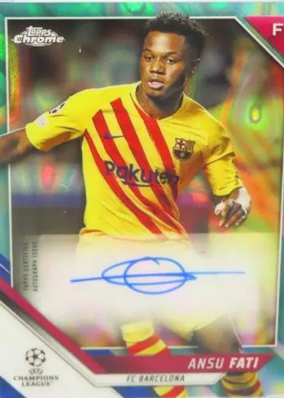 The Ansu Fati 2021 Topps Chrome UEFA Champions League #CA-AF Autographs - Aqua Lava Refractor card in Raw condition has not changed in price in the last 30 days and was last sold for $10.00 .