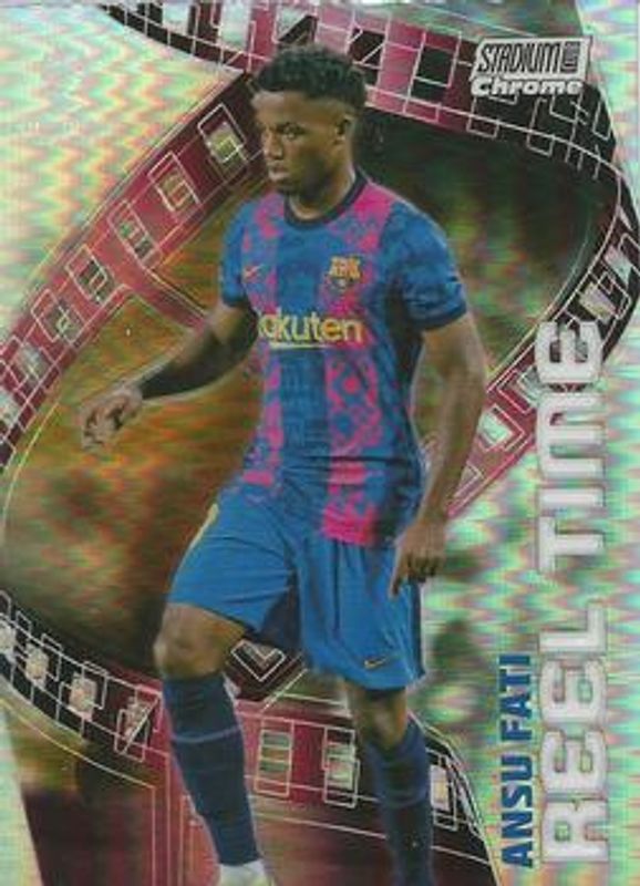 The Ansu Fati 2021 Topps Stadium Club Chrome UEFA Champions League #RT-AF Reel Time card is 1 of 42 Ansu Fati's card variations in the 2021 Topps Stadium Club Chrome UEFA Champions League set being tracked by Sports Card Investor, including Base, Blue Prism Refractor, Pink Red Electric Charge Refractor, Refractor, and Black & White Refractor /299.