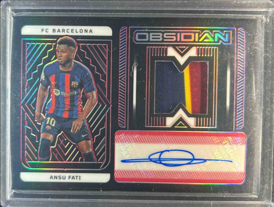 The Ansu Fati 2022 Obsidian #JA-AF Jersey Autographs Electric Etch - Red /25 card is 1 of 27 Ansu Fati's card variations in the 2022 Obsidian set being tracked by Sports Card Investor, including Jersey Autographs /199, Matrix Material Autographs /199, Jersey Autographs - Electric Etch Orange /75, Matrix Material Autographs - Electric Etch Orange /75, and Jersey Autographs - Electric Etch Purple /50.