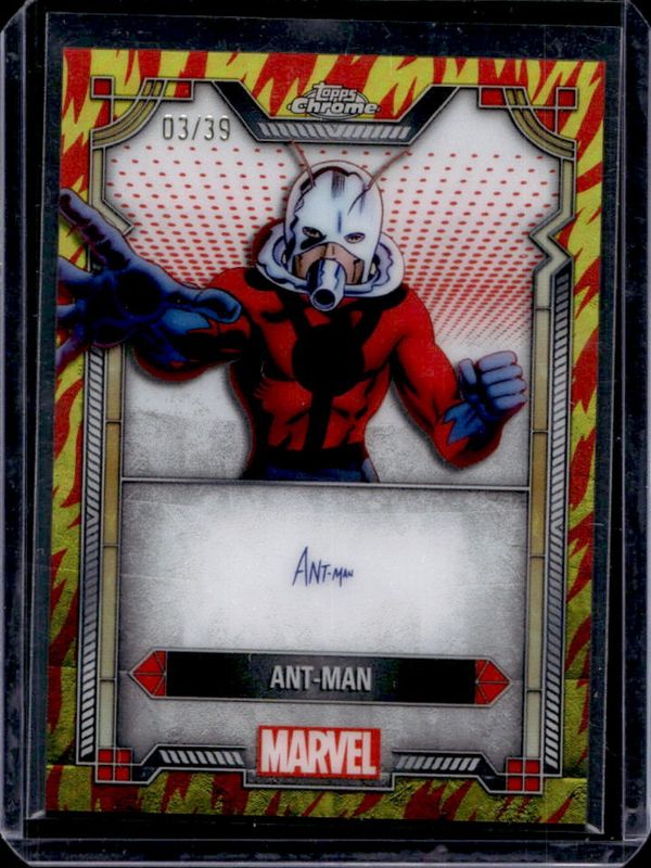 The Ant-Man 2024 Topps Chrome #MI-7 Marvel Character Autographs - Human Torch Refractor /39 card is 1 of 32 Ant-Man's card variations in the 2024 Topps Chrome set being tracked by Sports Card Investor, including Base, Refractor, Spiderweb Refractor /399, Blue Wave Refractor /150, and Green Gamma Ray Wave Refractor /99.