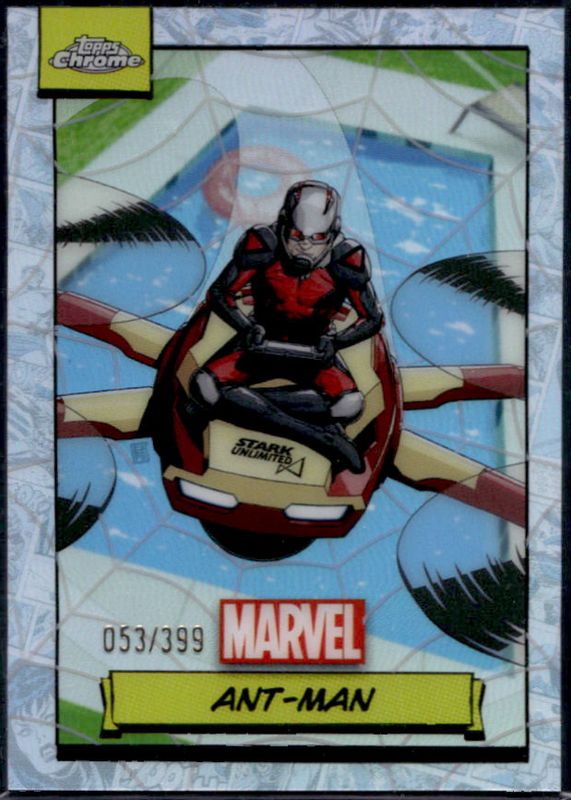 The Ant-Man 2024 Topps Chrome #59 Spiderweb Refractor /399 card is 1 of 32 Ant-Man's card variations in the 2024 Topps Chrome set being tracked by Sports Card Investor, including Base, Refractor, Blue Wave Refractor /150, Green Gamma Ray Wave Refractor /99, and Green Refractor /99.