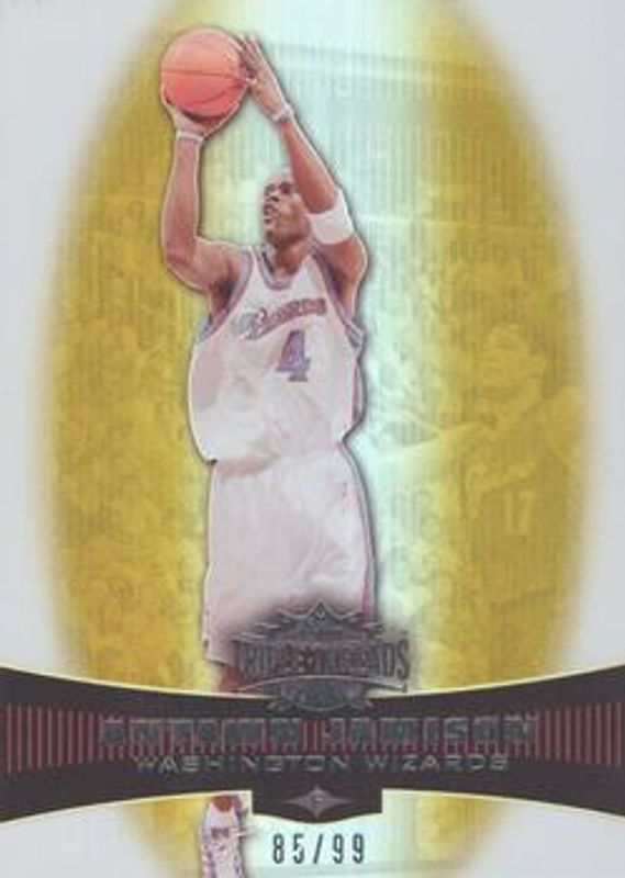The Antawn Jamison 2006 Topps Triple Threads #74 Gold /25 card is 1 of 28 Antawn Jamison's card variations in the 2006 Topps Triple Threads set being tracked by Sports Card Investor, including Base /99, Sepia /299, Emerald /50, Sapphire /10, and Platinum /1.