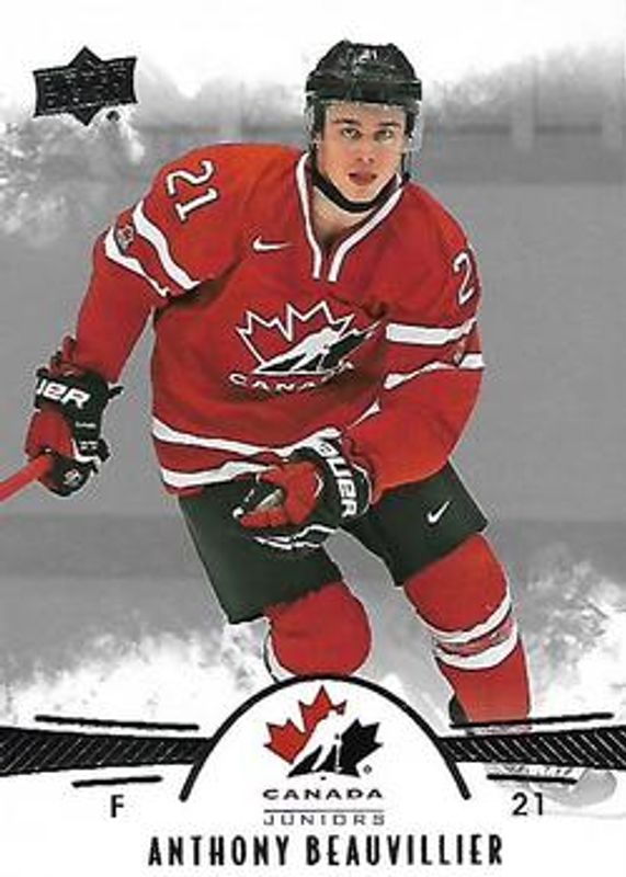 The Anthony Beauvillier 2016 Upper Deck Team Canada Juniors #34 Base Rookie card is 1 of 27 Anthony Beauvillier's card variations in the 2016 Upper Deck Team Canada Juniors set being tracked by Sports Card Investor, including #105 Base, #34 Exclusives /175, #34 High Gloss Spectrum /25, #34 Gold /16, and #105 Gold /16.