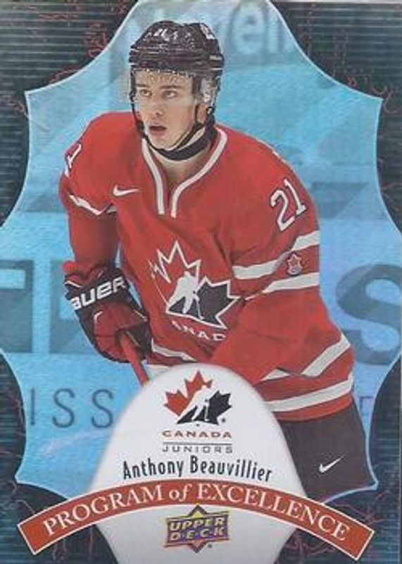 The Anthony Beauvillier 2016 Upper Deck Team Canada Juniors #POE-11 Program of Excellence Rookie card is 1 of 27 Anthony Beauvillier's card variations in the 2016 Upper Deck Team Canada Juniors set being tracked by Sports Card Investor, including #105 Base, #34 Base, #34 Exclusives /175, #34 High Gloss Spectrum /25, and #34 Gold /16.