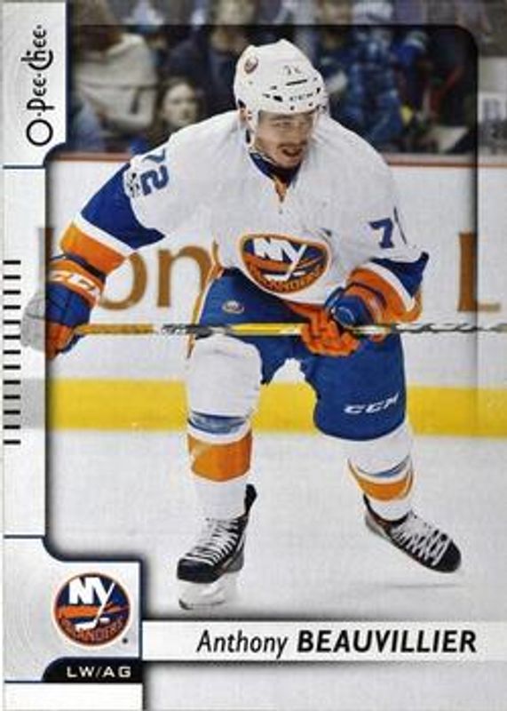 The Anthony Beauvillier 2017 O-Pee-Chee #49 Base card is 1 of 6 Anthony Beauvillier's card variations in the 2017 O-Pee-Chee set being tracked by Sports Card Investor, including Rainbow Foil, Red, Retro, Retro Blank Back, and Black Rainbow Foil /100.