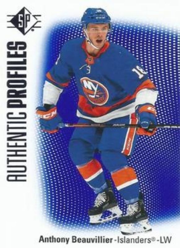 The Anthony Beauvillier 2021 SP #AP-11 Authentic Profiles - Blue card is 1 of 12 Anthony Beauvillier's card variations in the 2021 SP set being tracked by Sports Card Investor, including Authentic Profiles Jersey, Authentic Profiles - Patterned Foilboard, Authentic Profiles Patterned Foilboard - Gold, Authentic Profiles Patterned Foilboard - Green, and Authentic Profiles /1199.