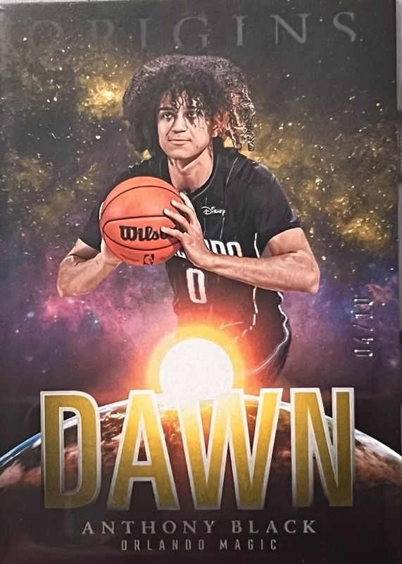 The Anthony Black 2023 Origins #2 Dawn - Gold /10 Rookie card in Raw condition has not changed in price in the last 30 days and was last sold for $75.00 .
