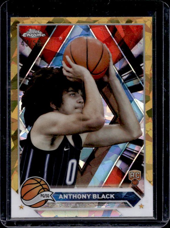 The Anthony Black 2023 Topps Chrome Sapphire Edition #186 Gold /50 Rookie card is 1 of 23 Anthony Black's card variations in the 2023 Topps Chrome Sapphire Edition set being tracked by Sports Card Investor, including Base, Orange /25, Purple /10, Red /5, and Padparadscha /1.
