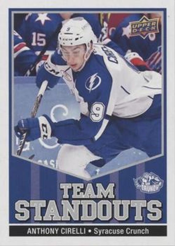 The Anthony Cirelli 2017 Upper Deck AHL #TS-25 AHL Team Standouts card is 1 of 9 Anthony Cirelli's card variations in the 2017 Upper Deck AHL set being tracked by Sports Card Investor, including Base, Rainbow Foil, Silver Foil, Printing Plates Black /1, and Printing Plates Cyan /1.