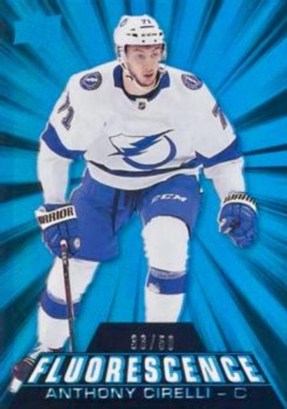 The Anthony Cirelli 2018 Upper Deck #F-7 Fluorescence - Blue /50 Rookie card is 1 of 20 Anthony Cirelli's card variations in the 2018 Upper Deck set being tracked by Sports Card Investor, including Young Guns Base, Young Guns Canvas, Young Guns - Clear Cut, Young Guns - Jumbo, and Young Guns - Silver Foil.
