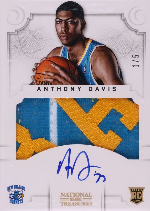 This card is 1 of 4 Anthony Davis' card variations in the 2012 National Treasures set being tracked by Sports Card Investor, including Rookie Patch Auto /199, Rookie Patch Auto - Jersey Number Prime /25, and Rookie Patch Auto - Logoman /1.