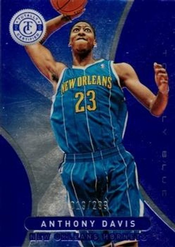 The Anthony Davis 2012 Totally Certified #29 Totally Blue /299 Rookie card is 1 of 19 Anthony Davis' card variations in the 2012 Totally Certified set being tracked by Sports Card Investor, including Base, Totally Red /499, Totally Gold /25, Totally Green /5, and Printing Plate Black /1.