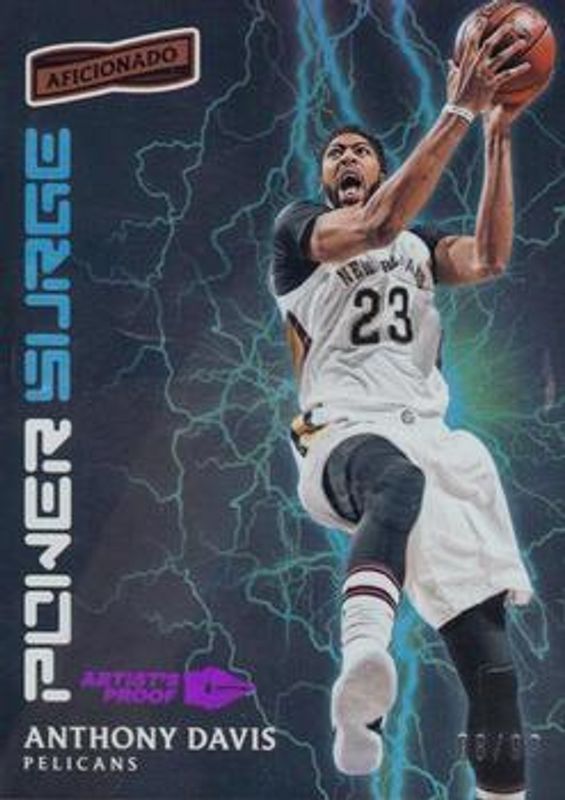 The Anthony Davis 2016 Aficionado #6 Power Surge Artist's Proof - Red /99 card is 1 of 13 Anthony Davis' card variations in the 2016 Aficionado set being tracked by Sports Card Investor, including Base, Artist's Proof, Opening Night Preview Edition, Tip Off, and Artist's Proof Red /99.