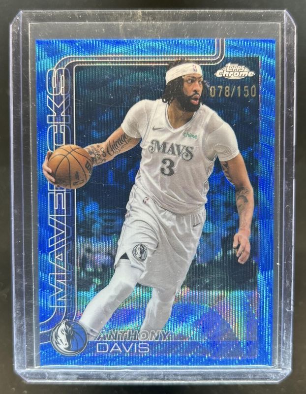 The Anthony Davis 2025 Topps Chrome #96 Blue Wave Refractor /150 card is 1 of 147 Anthony Davis' card variations in the 2025 Topps Chrome set being tracked by Sports Card Investor, including Base, Basketball Refractor, Box Set Refractor, Image Variation, and Lightboard Logo Refractor.