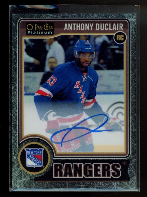 The Anthony Duclair 2014 O-Pee-Chee Platinum #RA-18 Rookie Autographs - Black Ice /99 card is 1 of 25 Anthony Duclair's card variations in the 2014 O-Pee-Chee Platinum set being tracked by Sports Card Investor, including #169a Base, #169b Base, #169 Platinum Traxx, #169 Rainbow, and #169 White Ice /199.