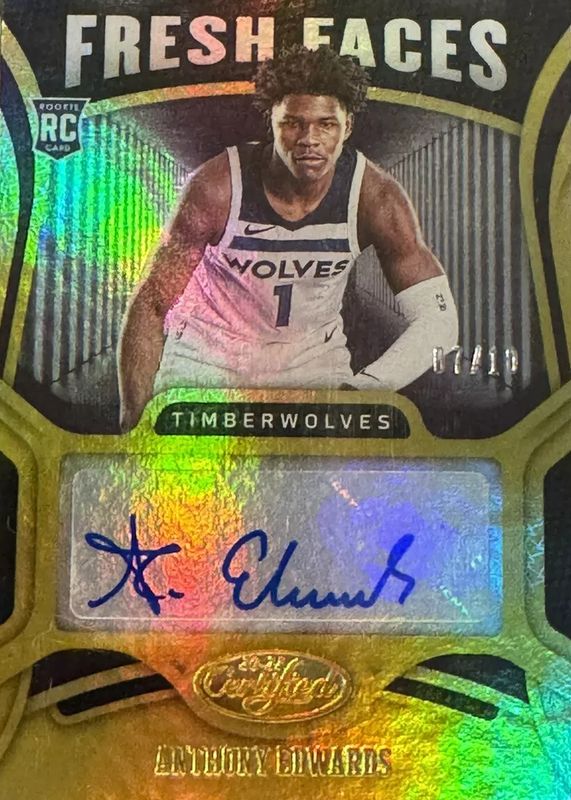 The Anthony Edwards 2020 Certified #FS-EDW Fresh Faces Signatures - Gold /10 Rookie card in Raw condition has not changed in price in the last 30 days and was last sold for $1,375.00 .